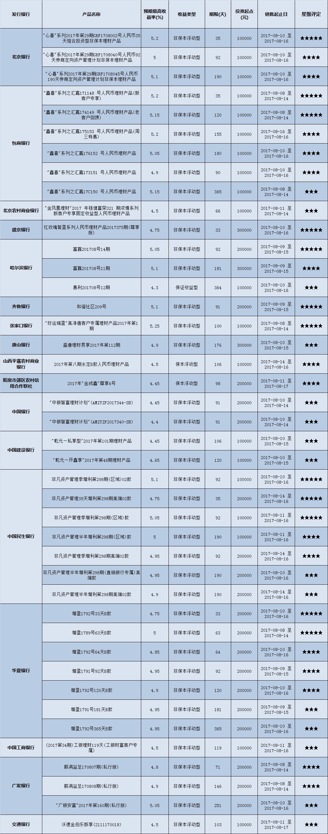 中等门槛(10万元至50万元(不含))的理财产品中,华北地区有42款获得普益标准星级评定,平均预期收益率为4.87%。其中三星产品15款,平均预期收益率为4.71%;四星产品15款,平均预期收益率为4.91%;五星产品12款,平均预期收益率为5.03%。