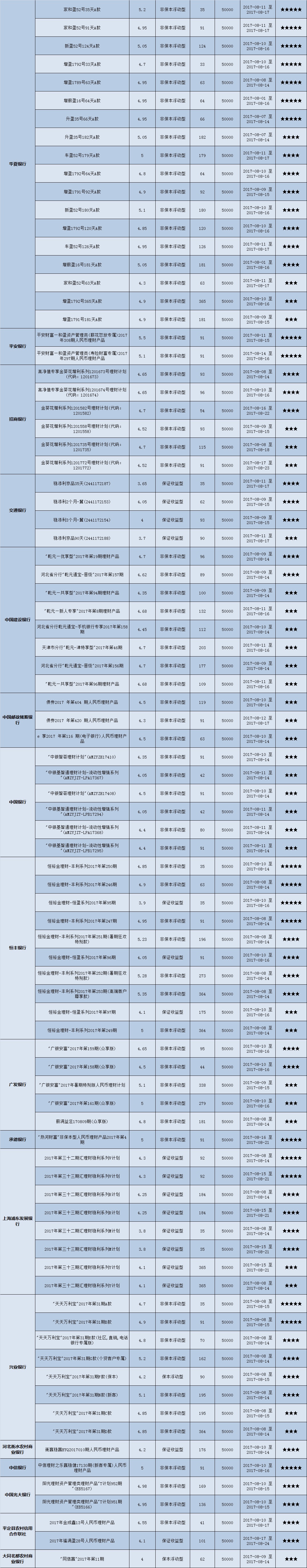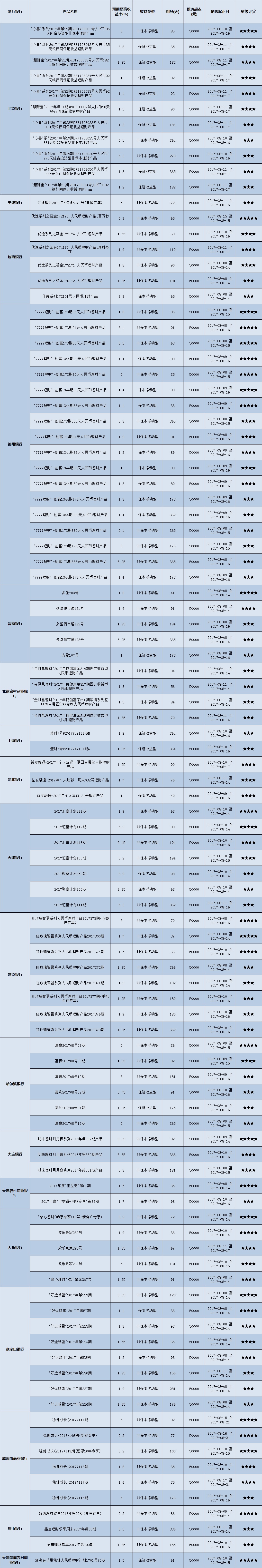 高门槛(50万元及以上)的理财产品中,华北地区有27款获得普益标准星级评定,平均预期收益率为4.99%。其中三星产品8款,平均预期收益率为4.9%;四星产品12款,平均预期收益率为5.04%;五星产品7款,平均预期收益率为4.99%。