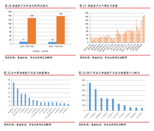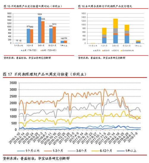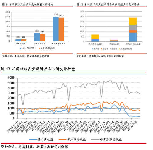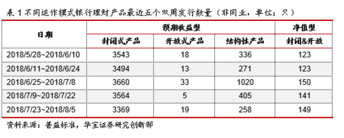 根据普益标准已公布的数据进行统计,2018年7月23日至8月5日,我国银行共发行非同业封闭式预期收益型理财产品3369只,较上一双周(2018年7月9日至7月22日)减少195只;发行开放式预期收益型产品19只,较上一双周增加14只;发行结构性预期收益型产品258只,较上一双周减少147只;发行净值型理财产品149只,较上一双周增加8只。