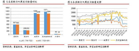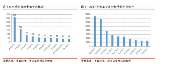 从单家银行发行情况来看,本次双周:建行、中行、民生银行(5.750, -0.03, -0.52%)、交行以及华夏银行(7.280, -0.04, -0.55%)分别发行312只、162只、86只、69只和55只,位列全部发行银行前五。城商行中发行量最大的是中原银行。农村金融机构中本双周进入前十的有青岛农商行和杭州联合农商行,分别位列第七、九。
