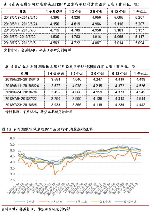 另外,我们统计(表内)保本理财各期限产品平均预期收益率:1个月以内3.03%、1-3个月3.86%、3-6个月4.12%、6-12个月4.24%、1年以上4.48%。与上一双周相比,所有期限品种均有不同程度下降,其中1个月以内下降26BP,幅度最大。