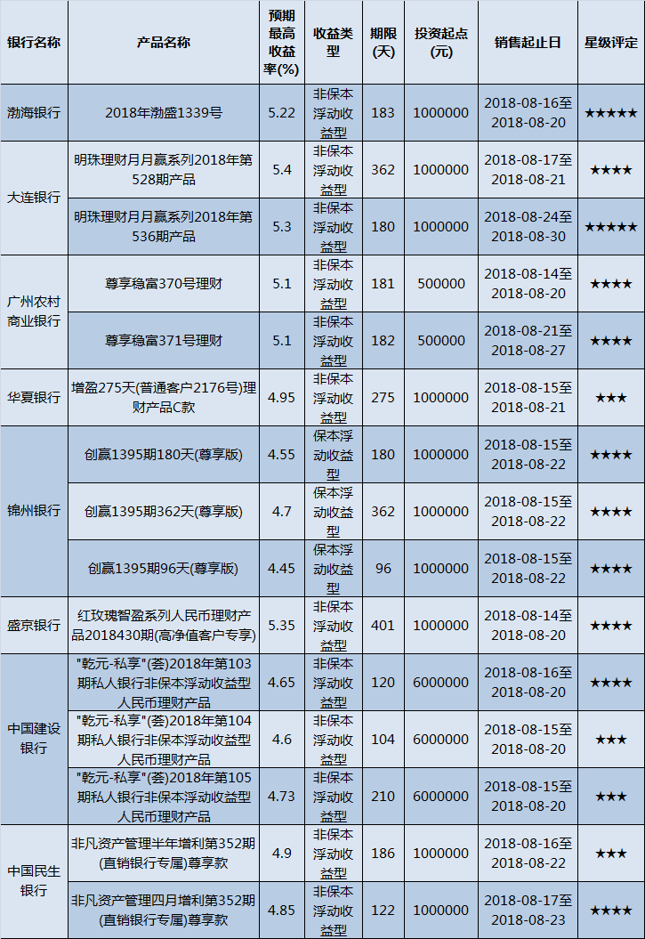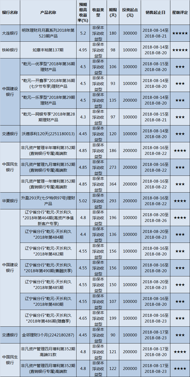 高门槛(50万元及以上)的理财产品中,东北地区有15款获得普益标准星级评定,平均预期收益率为4.92%。其中三星产品4款,平均预期收益率为4.8%;四星产品9款,平均预期收益率为4.91%;五星产品2款,平均预期收益率为5.26%。