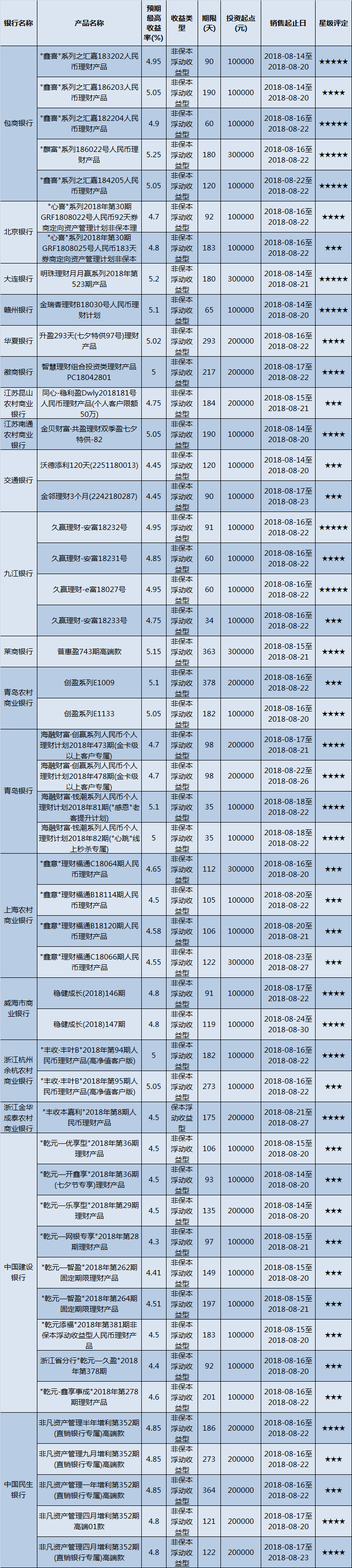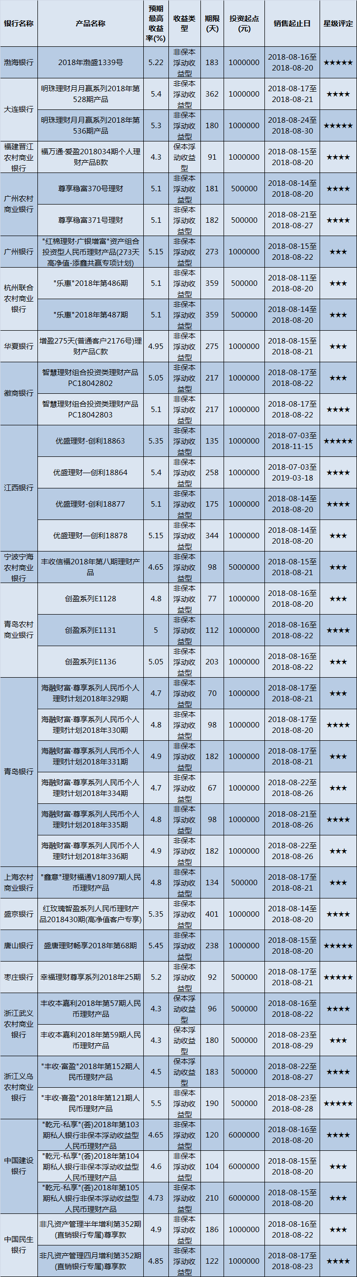 高门槛(50万元及以上)的理财产品中,华东地区有39款获得普益标准星级评定,平均预期收益率为4.96%。其中三星产品18款,平均预期收益率为4.86%;四星产品15款,平均预期收益率为4.92%;五星产品6款,平均预期收益率为5.34%。