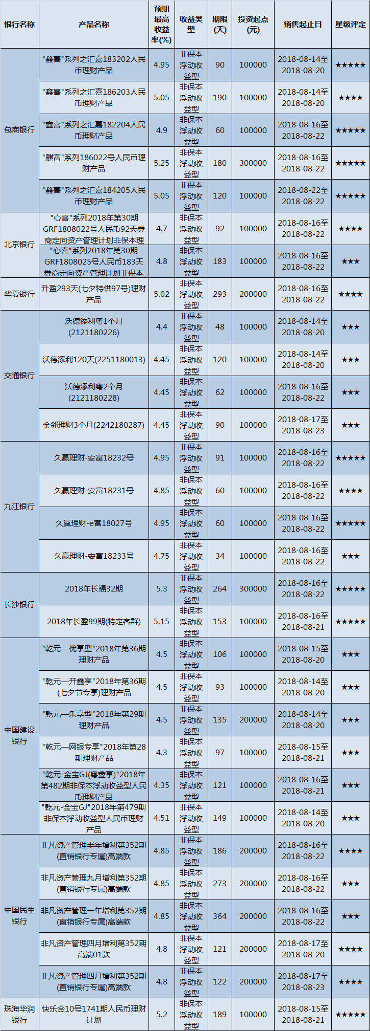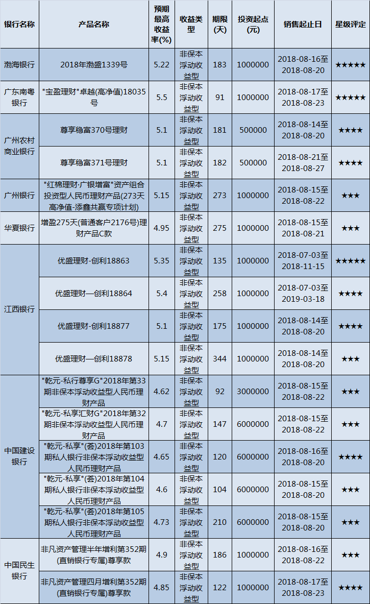 高门槛(50万元及以上)的理财产品中,华南地区有17款获得普益标准星级评定,平均预期收益率为5%。其中三星产品8款,平均预期收益率为4.85%;四星产品6款,平均预期收益率为5.03%;五星产品3款,平均预期收益率为5.36%。
