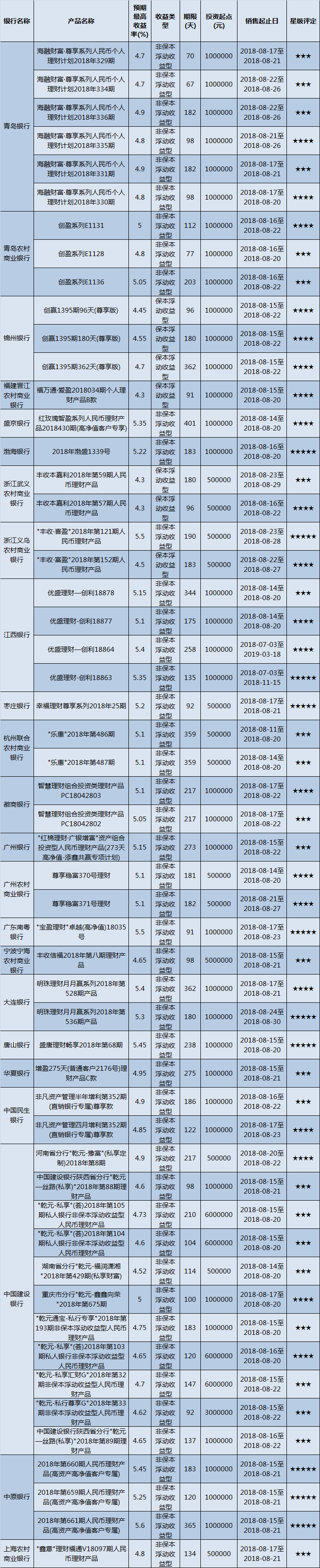 本周在售产品1235款,平均预期收益为4.66%。其中有925款获得普益标准星级评定,平均预期收益率为4.83%。其中三星产品431款,平均预期收益率为4.62%;四星产品310款,平均预期收益率为4.91%;五星产品184款,平均预期收益率为5.18%。